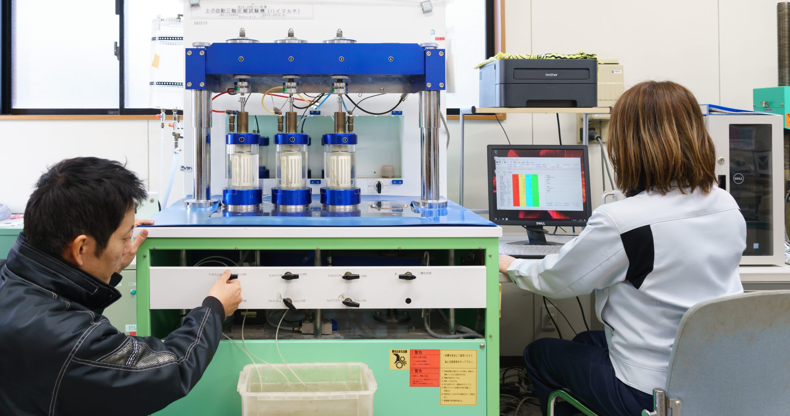 現場から採取した土試料を用い、密度・含水比・粒度分布・強度・透水性などを測定し、土の性質を詳細に分析 します。
