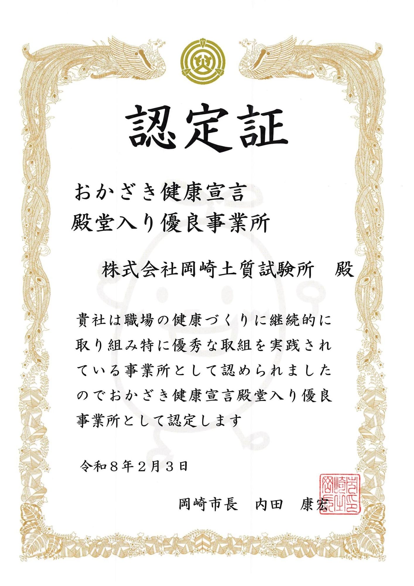 2026年(令和8年)2月3日、「おかざき健康宣言」の表彰式において、当社は最高位である**「金賞」を受賞いたしました 。あわせて、これまでの地道な取り組みを評価していただき、「殿堂入り優良事業所」**としても認定を賜りました 。